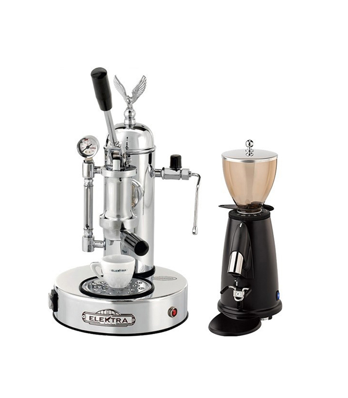 Elektra, eine Marke, die eine Stilikone ist. Dank der Verwendung von Materialien wie Kupfer, Messing, Holz und der Suche nach einem klassischen Retro-Design sind Elektra-Espressomaschinen ein Synonym für Eleganz und Raffinesse. Die Sets aus Elektra-Sockeln, deren Design auf die Maschine und die Kaffeemühle abgestimmt ist, bringen eine alte Wiener Kaffee-Atmosphäre in Ihre Küche!